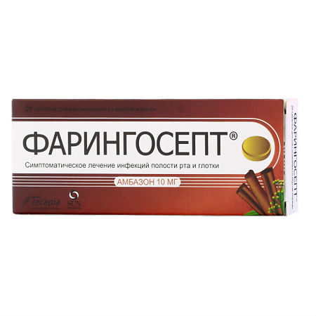Главным компонентом таблеток «Фариногсепт» является амбазон (в форме амбазона моногидрата). Это кристаллическое вещество темно-коричневого цвета, плохо растворимое в воде, является эффективным антисептиком. Амбазон активен в отношении болезнетворных бактерий, вызывающих развитие инфекционных заболеваний верхних дыхательных путей и ротовой полости: гемолитического стафилококка, стрептококка, пневмококка. Его применение не оказывает негативного влияния на микрофлору кишечника.